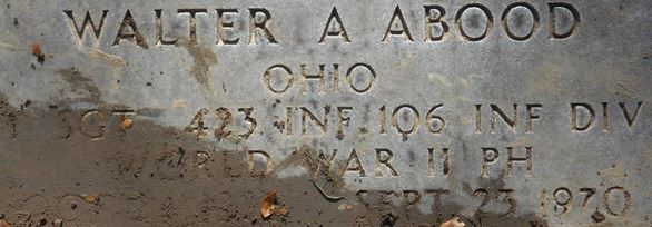 | Abood, Walter A. | 35 604 669 | SSgt | 423 INF/2 BN/H | WIA | Expert Infantry Badge CIB Prisoner of War EAME/4 PH | 4-B Muhlberg Sachsen | Birth 24 Oct 1923 Death 23 Sep 1970 (aged 46) Burial Holy Cross Cemetery Akron, Summit County, Ohio, USA | Combat Infantryman Badge 12/16/1944 GO 1945-051 | Abood-WalterA-423H-4B.jpg | 27, 62, Atterbury Camp Crier 6/2/44, GO 1945-051, FAG 150465021 | |||