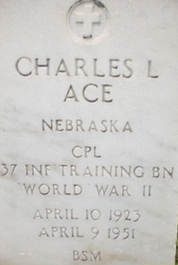| Ace, Charles Lee | 17 116 716 | Pfc | 423 INF/1 BN/HQ | CIB Prisoner of War EAME/4 | 4-B Muhlberg Sachsen | Death 04/09/1951 (27) Wyuka Cemetery Lincoln, Lancaster County, Nebraska, USA | Combat Infantryman Badge 12/16/1944 GO 1945-051 Gerolstein to IV-B boxcar roster of Donald E. Cooley. D.E.Cooley's 40 & 8. 12/18/1944. Escaped with Don Cooley to Muhlburg. During World War II he took part in The Battle of the Bulge, where he was taken prisoner. After going through the war and being a prisoner-of-war, Charles died a day before his 28th birthday of cancer. | Ace-CharlesL.jpg | Ace-CharlesL.jpg | 27, 62, CUB 1947-01-02, CUB 1989-7/8/9, GO 1945-051, Find-A-Grave 21760020, Times-Herald Alliance Nebraska 12/30/1994 | |||