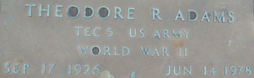 | Adams, Theodore R. | Pvt/T5 | 423 INF | MIA | EAME/4 | POW | Birth 17 Sep 1926 Death 14 Jun 1978 (aged 51) Burial Rest Haven Cemetery Wilson, Wilson County, North Carolina, USA | Pvt Ted Adams, former Courier reporter who returned to Waterloo several weeks ago after having been liberated from a German prison camp, will speak for the 7th War Loan Campaign. He was captured by the Nazis while in action with the 106th Division. Now stationed at Schick General Hospital, Clinton IA. | Adams-TheodoreR-423-unk.jpg | 1, Courier, Waterloo IA 06/14/1945, FAG 123327972 | ||||