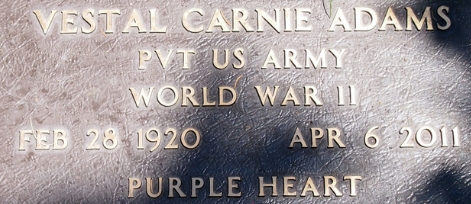 | Adams, Vestal Carnie | 37 137 148 | Pfc | Div Hq Special Troops | PH | Death 04/06/2011 (91) Memorial Gardens Burley, Cassia County, Idaho, USA | Adams-VestalC.jpg | Adams-VestalC.jpg | 100, Find-A-Grave 68057816 | |||||