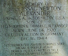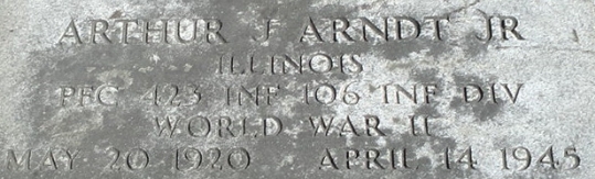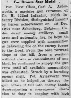 | Aylesworth, Carl A. | Pfc | 422 INF/H | KIA 12/21/1944 while reconnoitering a withdrawal route | CIB, PH, BS, Recommended for SS | Death 12/21/1944 (19) Union Cemetery Edmeston, Otsego County, New York, USA | Bronze Star War Department GO 1947-046.&nbpsS/Sgt Raymond F. Jones and Pfc Carl Aylesworth were reconnoitering a withdrawal route, were killed by small arms fire, and were recommended for the Silver Star. "Mr. and Mrs. Asel Aylesworth have received a telegram from the War department that the body of their son, Pfc. Carl Aylesworth is en route home from Antwerp, Belgium. Pfc. Carl Aylesworth was killed in the Battle of the Bulge on December 21st, 1944. Upon the arrival of the body arrangements will be made for funeral services with full military rites." ["The Otsego Farmer & Republican" (Cooperstown, NY), Fri., Mar. 18, 1949, Page Seven] | Aylesworth-CarlA.jpg | Aylesworth-Carl-2.jpg | CUB 1946-09, 013, 053, WD GO 1947-046, 065, Lewis Walker Diary, 102, "Cub In Review", Find-A-Grave 103197741 | ||||