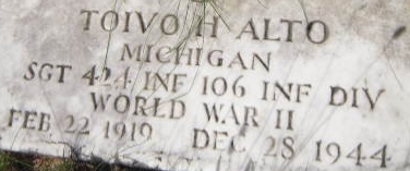 | Autio, Kenneth Roy 'Ken' | 36 456 656 | Pvt | 745 Rifleman | 106 Recon Cav (Mech) | WIA | PH | Birth 15 Nov 192 4 Death 19 Sep 1991 (aged 66) Burial Resthaven Cemetery Iron River, Iron County, Michigan, USA | NEWS ARTICLE Iron River Reporter April 24 1945 "Bates Soldier Wounded April 2 In Germany" | Autio-KennethRoy-a.jpg | Ed Strand 02/2016, FAG 40060869 | |||