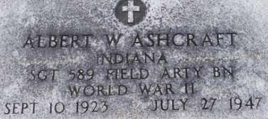 | Ashcraft, Albert W. | 35 725 625 | Cpl | 589 FABN/Batt B | Belgian Fourregerre CUB Vol 8, No 2, 11/1951 | Death 07/27/1947 (23) Carlisle Odd Fellows Cemetery Carlisle, Sullivan County, Indiana, USA | Ashcraft-AlbertW.jpg | 8, Find-A-Grave 138491809 | ||||||