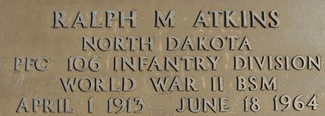| Atkins, Ralph M. | 37 588 301 | Pvt | 423 INF/HQ | CIB, EAME/4 | Birth 1 Apr 1913 Death 18 Jun 1964 (aged 51) Burial Mohall Cemetery Bottineau County, North Dakota, USA | Atkins-RalphM.jpg | CUB 1954-1/2, 27, Camp Crier 07/28/1944, FAG 92810511 | ||||||