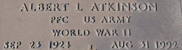 | Atkinson, Albert L. | 34 876 020 | Pfc | 424 INF/CN | CIB | Death 08/31/1992 (67) Hickory Grove Cemetery Laurel, Jones County, Mississippi, USA | Atkinson-AlbertL.jpg | 27, Find-A-Grave 84142714 | ||||||