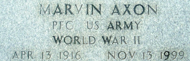| Axon, Marvin | 34 196 734 | 423 INF/2 BN/E | CIB, POW, EAME/4 | 9-B Bad Orb Hessen-Nassau, Prussia | Death 11/13/1999 (83) Adams Chapel Cemetery McDuffie County, Georgia, USA | Combat Infantryman Badge 12/16/1944 GO 1945-051 | Axon-Marvin.jpg | 62, GO 1945-051, Find-A-Grave 86020929 | |||||