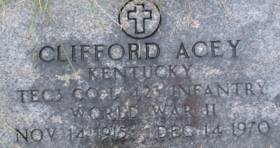 | Acey, Clifford | 35 460 935 | T/4 | 423 INF/3 BN/L | CIB Prisoner of War EAME/4 | 9-B Bad Orb Hessen-Nassau, Prussia | Death 12/14/1970 (55) Science Hill Cemetery Science Hill, Pulaski County, Kentucky, USA | Combat Infantryman Badge 12/16/1944 GO 1945-051 | Acey-Clifford.jpg | 27, 62, GO 1945-051, | ||||