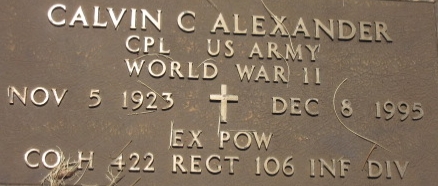 | Abell, Albert E. | 34 515 320 | Pfc/SSgt | 423 INF/CN | CIB Prisoner of War EAME/4 Bronze Star | Captured 12/21/1944 4-B Muhlberg Sachsen transferred to 8-A Liberated 04/11/1945 British 2nd Armored Div | Death 03/01/1996 | Combat Infantryman Badge 12/16/1944 GO 1945-051. Promoted to SSgt just before Battle of the Bulge and paperwork was lost. When captured he weighed 170 lbs and when liberated weighed less than 90. Suffered two concussions - one during the initial battle when the foxhole next to him was obliterated by German artillery and a second when a U.S. P-38 mistakenly bombed a barracks the Germans were holding prisoners in as a field hospital. It was not marked so definitely not the pilot's fault. He was sitting on the inside of a wall, the bomb hit outside the wall and blew it basically over the top of him. | Bell-Albert-423CN-POW.jpg | 27, 62, Ervin Szpek, Jr. 3/2013, GO 1945-051 | ||||