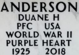 | Austin, Duane V. | 15 377 487 | Pvt | 422 INF/CN | CIB | Death 12/14/2012 (87) Marlboro Cemetery Marlboro, Stark County, Ohio, USA | From the Alliance Review 17 Dec 2012 Duane graduated in 1946 from Alliance High School after serving three years in the European Theater during World War II in the United States Army. Three bronze stars were earned experiencing the D-Day Invasion and the Battle of the Bulge. He was a lifetime member of the American Legion. | 27, Find-A-Grave 59812886 | ||||||