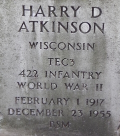 | Atkins, Howard Franklin | 34 804 961 | Pvt | 422 INF/D | CIB | Death 07/01/1944 (34) Fort Snelling National Cemetery Minneapolis, Hennepin County, Minnesota, USA | Atkins-HowardF.jpg | 27, Find-A-Grave 302594 | ||||||