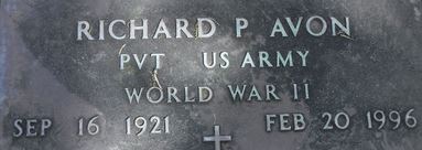 | Avon, Richard P. | 32 588 087 | Pfc | Medic | 331 Medical BN | CMB, 331st Medical Battalion Cited for service from 12 December 1944 to 12 February 1945 | Birth 16 Sep 1921 Death 20 Feb 1996 (aged 74) Burial Fred Hunter's Hollywood Memorial Gardens North Hollywood, Broward County, Florida, USA | Combat Medical Badge GO 1945-076 | Avon-RichardP.jpg | 33, GO 1945-076, FAG 71267212 | ||||