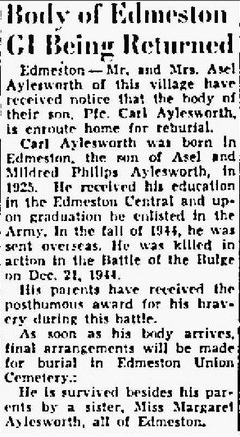 | Aylesworth, Carl A. | Pfc | 422 INF/H | KIA 12/21/1944 while reconnoitering a withdrawal route | CIB, PH, BS, Recommended for SS | Death 12/21/1944 (19) Union Cemetery Edmeston, Otsego County, New York, USA | Bronze Star War Department GO 1947-046.&nbpsS/Sgt Raymond F. Jones and Pfc Carl Aylesworth were reconnoitering a withdrawal route, were killed by small arms fire, and were recommended for the Silver Star. "Mr. and Mrs. Asel Aylesworth have received a telegram from the War department that the body of their son, Pfc. Carl Aylesworth is en route home from Antwerp, Belgium. Pfc. Carl Aylesworth was killed in the Battle of the Bulge on December 21st, 1944. Upon the arrival of the body arrangements will be made for funeral services with full military rites." ["The Otsego Farmer & Republican" (Cooperstown, NY), Fri., Mar. 18, 1949, Page Seven] | Aylesworth-CarlA.jpg | Aylesworth-Carl-2.jpg | CUB 1946-09, 013, 053, WD GO 1947-046, 065, Lewis Walker Diary, 102, "Cub In Review", Find-A-Grave 103197741 | ||||